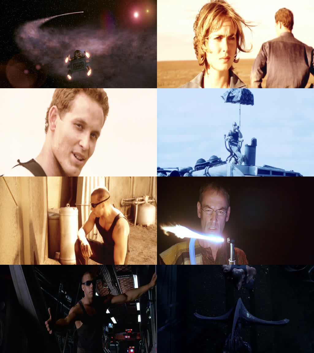 In the first half of Pitch Black, the outside shots are supposed to be lit by the 3 suns and the editor has graded the shots with strong, washed out hues. I don't usually like heavily saturated frames but in this case it's an appropriate use because it fits the environment and it works well.